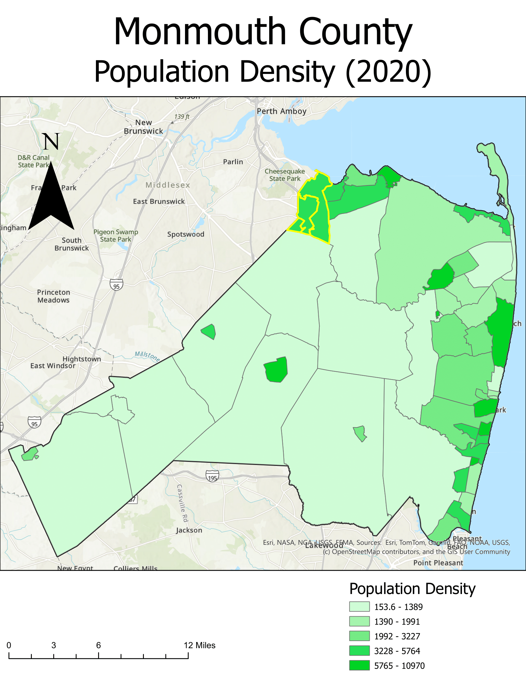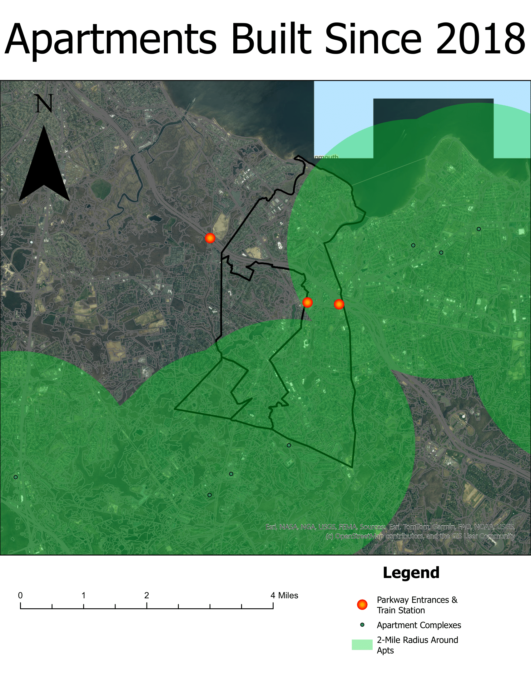 In addition to learning more of the complexities behind using Esri’s ArcGIS Pro, I found that the overdevelopment problem in my town was a little more complicated than initially expected. Matawan/Aberdeen serves an essential purpose to the surrounding towns, as it is not only home to the Matawan Train Station (located along the North Jersey Coast Line), but also has two entrances to the Garden State Parkway (Exits 120 and 117). There has, in fact, been an uptick in the construction of new apartment complexes, but interestingly, none of these are actually located within Matawan or Aberdeen. They are instead located in surrounding towns that use Matawan/Aberdeen’s roads and transportation lines for their morning commute and other activities. This leads to the perception by Matawan/Aberdeen residents that overdevelopment has led to the towns feeling too crowded, when in actuality, its nearby towns are developing at a faster rate than they previously did, which is leading to the congestion of Matawan/Aberdeen’s road and transportation infrastructure.